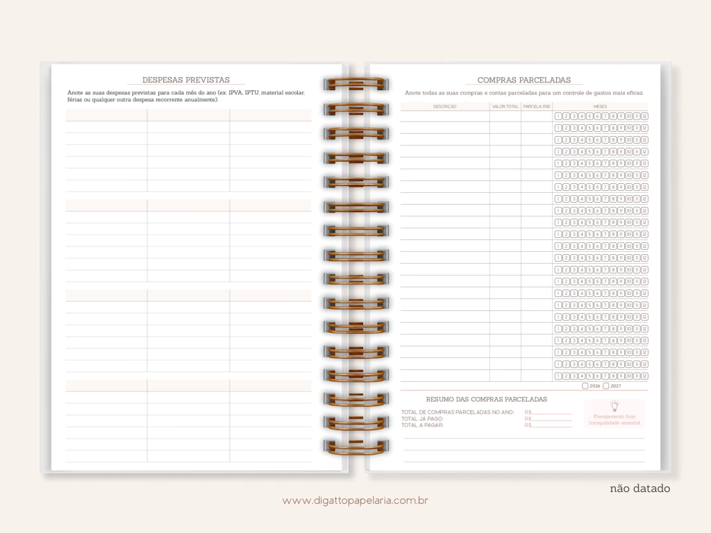 O Smart Planner, é a solução compacta e funcional para quem busca organização sem complicações. Com um design minimalista e as ferramentas essenciais, ele é perfeito para quem precisa de um planejamento eficiente, mas sem muitos detalhes para preencher. Ideal para otimizar sua produtividade, o Smart Planner oferece o equilíbrio perfeito entre simplicidade e funcionalidade, ajudando você a manter suas tarefas em dia de forma prática e rápida.
